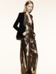E se i primi outfits della collezione vengono caratterizzati da stampe, bluse etniche e un certo sapore “Seventies” dato soprattutto dalla forma dei pantaloni (aderenti ma aperti a campana verso il basso) andando avanti ci si imbatte in un mood decisamente più romantico e sofisticato. Stampe a motivo centrino e inserti di pizzo si insinuano in capi affusolati e dalla sensualità appena accennata. La trasparenza ammicca strategica sotto forma di spacchi, effetti vedo non vedo e velate aperture sulla pelle nuda. A chiusura capi l'oro, che non è solo un colore ma fluida materia che dà vita a una silhouette semplice ma di classe.