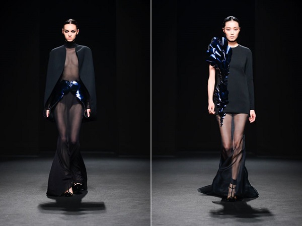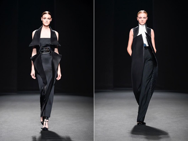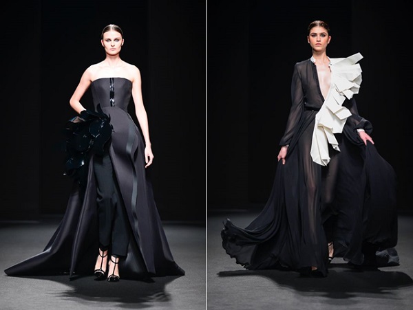 oversize asimmetriche e decori importanti come altorilievi immessi sulle spalle di grande effetto. Moduli di raso di seta nera emergono dal tronco ed includono rete, piume di struzzo,