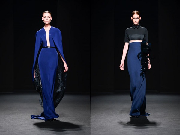 couturier pavoneggiavano lungo il perimetro dei quattro angoli del palco. Come i movimenti forti, taglienti e le grida avvinte del ballerino spagnolo, i pezzi di Rolland sono formati di quella combinazione di austerità e sensualità: origami e pieghe che contrastano con i marosi (moti ondosi del mare in tempesta) più ariosi di crepe di seta liquida o satinato