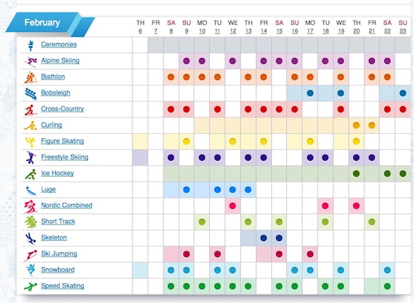 IL PROGRAMMA - Si parte l'8 Febbraio alle 6:30 italiane con lo snowboard per poi proseguire via via con tutti gli altri appuntamenti fino ad arrivare forse alla gara più attesa, la finale maschile di hockey, che si disputerà domenica 23 Febbraio alle ore 13. Il tutto verrà concluso sempre in giornata con la cerimonia di chiusura dei giochi prevista per le ore 17.