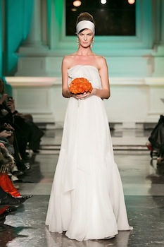 La sposa minimal e aristocratica è destinata all’estate: un abito color bianco sale, realizzato con una leggera sovrapposizione di seta, dallo scollo decolté e con uno piccolo sbalzo a ventaglio. Al bando il classico “velo” sostituito con una semplice fascia di seta ad incorniciare il viso: un abito sposa semplicemente perfetto per un matrimonio sulla spiaggia carezzato dalla leggera brezza marina.