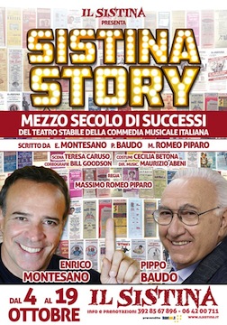 ROMA - Dal 4 al 19 ottobre al teatro Sistina di Roma di scena il "Sistina Story" ovvero il racconto del più amato Teatro di Roma e tra i principali d'Italia attraverso la musica. Il Sistina è riconosciuto dal Ministero dei Beni culturali quale unico Teatro Stabile della Commedia musicale italiana. Saranno presenti Pippo Baudo e Enrico Montesano con un'orchestra di 20 elementi diretta dal Maestro Maurizio Abeni, 18 performer che ballano e cantano dal vivo coreografati da Bill Goodson, due bravissime "Prime Donne" già note al pubblico del Sistina, Sabrina Marciano e Valentina Spalletta. Durante la conferenza stampa che si è svolta ieri a Roma, il Direttore artistico del Teatro Sistina, Massimo Romeo Piparo, ha parlato dei motivi che lo hanno spinto a questa realizzazione e dello staff che ha dato vita al progetto: