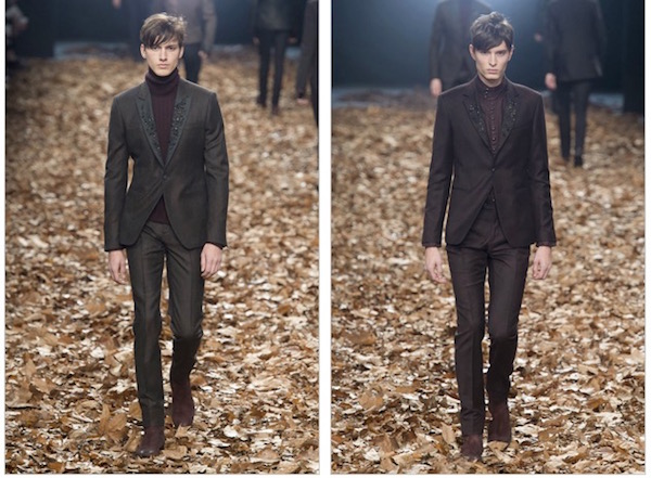 La silhouette è affusolata senza mai esagerare nelle proporzioni: giacche a tre bottoni sono abbinate a pantaloni stretti o a jeans di pelle nera corti al punto da scoprire le caviglie e i dettagli metallici dei boots così da conferire una patina giovane e ricercata.