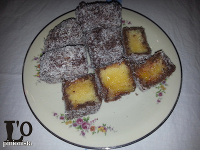 LAMINGTONS - I lamingtons sono dolcetti, tipici dell'Australia, molto goduriosi e semplici da preparare; si possono fare in diversi modi, farciti con marmellata o crema o semplicemente glassati con cioccolato e coperti con scaglie di cocco. Per la serata multietnica è stata realizzata una versione light; in sostituzione del pan di spagna, ho preparato una semplicissima torta soffice all'acqua ed accostando al sapore del cioccolato fondente la prelibatezza della marmellata di arance.