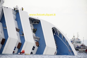 Un altro scossone, si piega ulteriormente a destra: alcuni viaggiatori volano in acqua, altri corrono disperatamente verso i gommoni e le scialuppe. Ci sono imbarcazioni che faticano ad essere calate proprio per via della posizione inclinata della nave. Prima ancora che venissero informate le Capitanerie di porto sono arrivate diverse chiamate di aiuto al centralino dei carabinieri di Grosseto: venivano dagli stessi passeggeri della nave. E anche questo è fonte di dubbi e di polemiche. L’errore umano è fra le piste più accreditate anche se in questa fase nessuna viene esclusa, compreso il guasto alle apparecchiature tecniche e radar. Il comandante Schettino, sentito dalla capitaneria sottolinea di aver agito rispettando tutte le regole. Eppure chi indaga gli ha contestato oltre all'omicidio colposo plurimo e al naufragio anche di aver abbandonato la nave. Il comandante non si trovava. Forse in stato di shock, forse scivolato in mare, è stato rintracciato sulle rocce a riva.