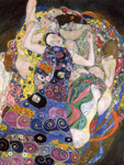 Vergine, dipinto del 1913, Klimt si avvale solo di colori puri e di una stesura caleidoscopica con le sue labirintiche tortuosità. Anche in questa composizione viene raccontata una storia: la ragazza diventa donna, ne vediamo il risveglio dei sensi che la porteranno all’estasi d’amore. I diversi momenti percorrono il medesimo essere che si moltiplica, come in un sogno; le varie pose e sensazioni delle parti separate dei corpi femminili paiono roteare e l’anatomia diviene ornamento e l’ornamento anatomia.