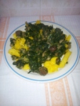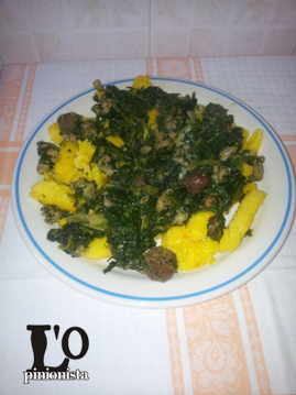 – quando la polenta inizia a staccarsi dalle pareti del paiolo (o della pentola), spegnere la fiamma; versare la polenta in un piatto piano e condirla con la verdura preparata precedentemente.