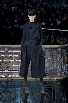nuance come il verde oliva, blu scuro, prugna, il grigio e il nero. Boots con cinturino e stivaletti col tacco squadrato tra gli accessori. A firmare i cappelli con la visiera in stile maoista, il designer Stephen Jones.