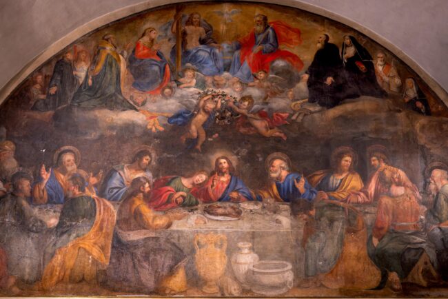In diverse porzioni della chiesa, alle pareti, si trovano resti di affreschi del XII e XIII secolo. A palazzo San Macuto, nella sala del Refettorio, un imponente dipinto sulla parete di fondo rievoca la cena in Emmaus, dove ebbe luogo una delle prime apparizioni del Cristo risorto, di autore anonimo. Altre due opere, a medesimo tema, sono conservate nei depositi: l’olio su tela “Gesù in Emmaus”, proveniente del Museo di Capodimonte e “I pellegrini in Emmaus” di Nicola Vaccaro (Napoli 1640 – Napoli 1709), di identica provenienza.