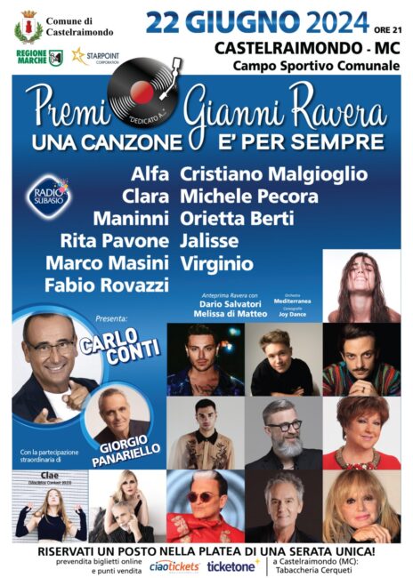 “Per il secondo anno, il prestigioso Premio Ravera trova casa nella magnifica Castelraimondo – aggiunge Michele Pecora. Il Premio è nato da un’idea che ho coltivato a lungo per celebrare Ravera, al quale devo tutto perché è grazie a lui se ho potuto fare nella vita quello che desideravo, realizzando il mio sogno artistico. La partecipazione e l’entusiasmo dei grandi personaggi che negli anni lo hanno accolto, è la conferma che il marchigiano Ravera ha permesso a moltissimi artisti di brillare, ricordando che le canzoni sono un vero e proprio “patrimonio nazionale” da valorizzare”. Ad aprire la serata, come di consueto, ci saranno Melissa Di Matteo (artista poliedrica, cofondatrice del Premio) con il mitico critico e giornalista Dario Salvatori a introdurre giovani promesse della musica provenienti da tutta Italia.