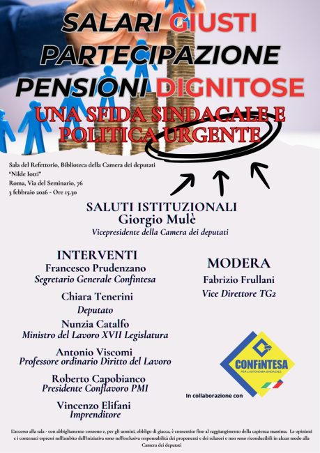 ROMA – Nel pomeriggio di oggi, 3 febbraio, a partire dalle ore 15.30 presso la Sala del Refettorio di Palazzo San Macuto si svolgerà il convegno “Salari giusti, partecipazione, pensioni dignitose, una sfida sindacale e politica urgente”.
